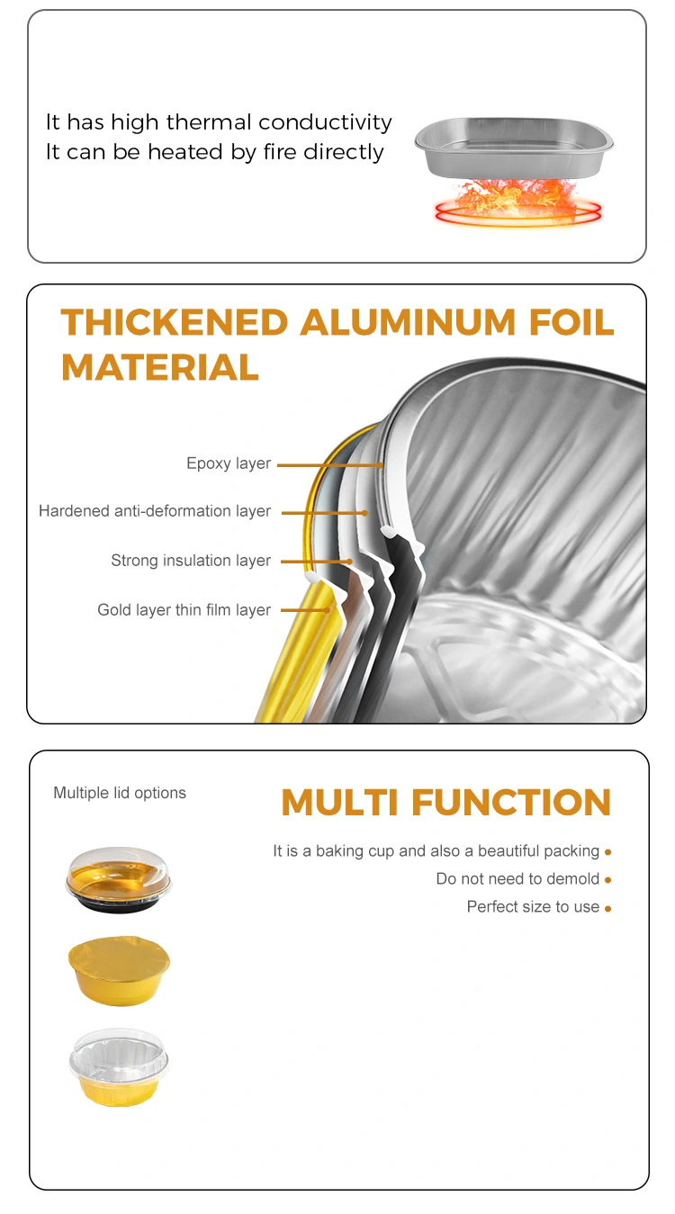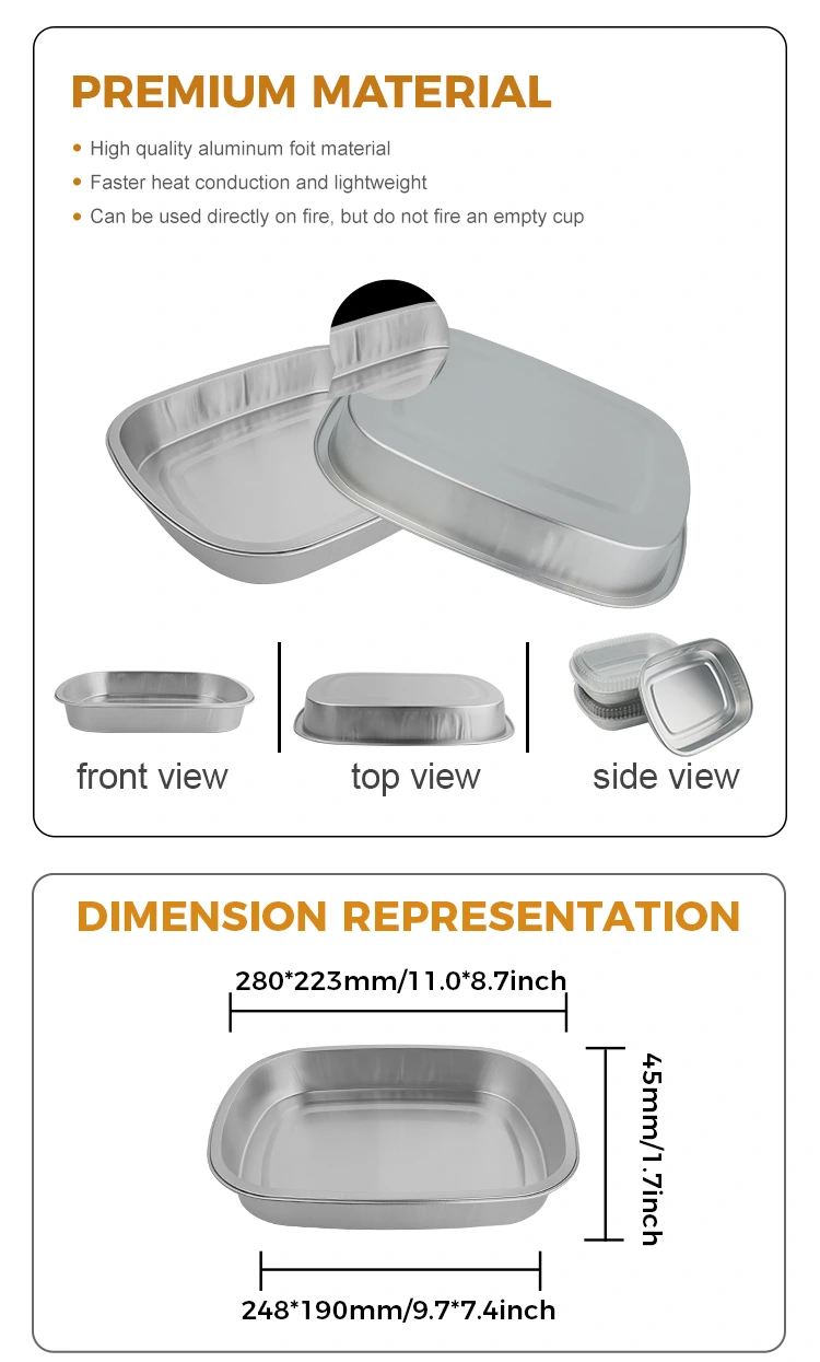 4. تعتمد مقالي الطعام المصنوعة من رقائق الألومنيوم المربعة المصنوعة من رقائق الألومنيوم على خطوط بسيطة وأنيقة، يكملها بريق فضي حديث. يمكن أن يعزز المظهر البصري للطعام والجودة الشاملة، مما يساعد على تعزيز الصورة الاحترافية والراقية للعلامة التجارية.