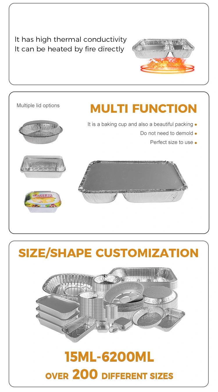 لا يحتوي صندوق غداء رقائق الألومنيوم هذا على خصائص عزل حرارية فحسب ، بل يمكن أيضًا إقرانها بغطاء رقائق الألومنيوم ، مما يعزز التطبيق العملي للمنتج. بالإضافة إلى ذلك ، نقدم أيضًا خدمات شعار مخصصة لتعزيز صورة العلامة التجارية وتحسين نقاط ذاكرة العملاء.