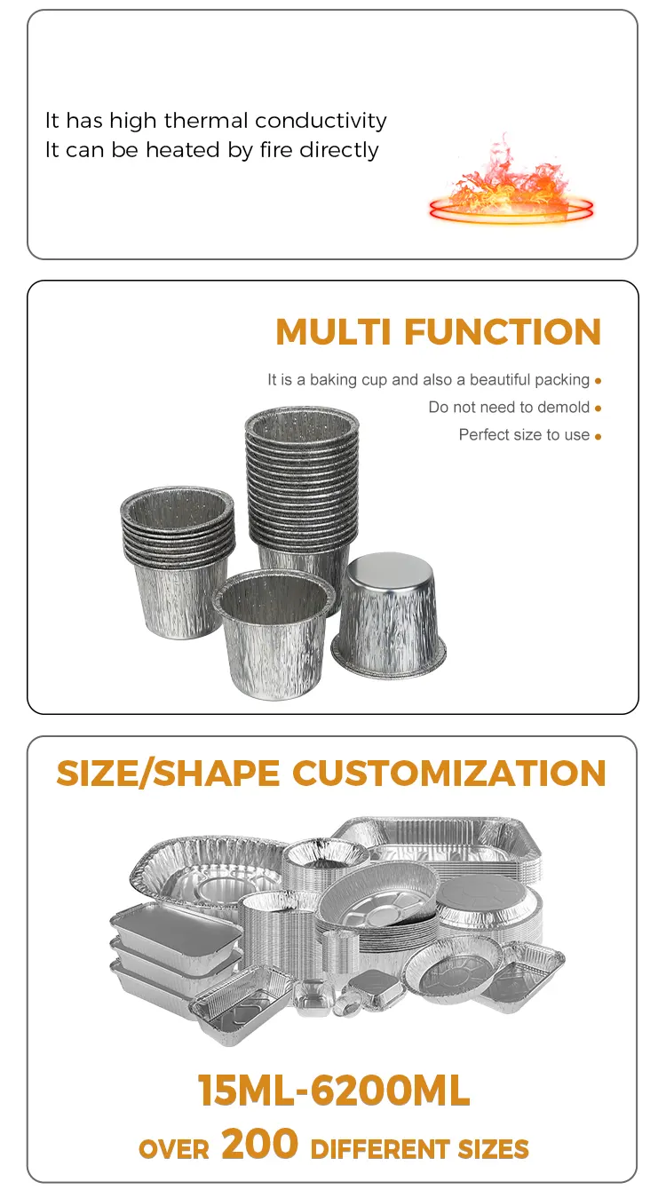 تم تصميم حاوية رقائق الألومنيوم الفضية ذات الكوب الدائري القابل للتصرف من Yunchu Aluminium Foil Manufacturer لتكون قابلة للاستخدام مرة واحدة ويمكن التخلص منها، مما يزيل تمامًا مشكلة تنظيف القالب. سواء أكان الأمر يتعلق بالتنظيف والتشطيب بعد الخبز المنزلي أو الدوران الفعال للوجبات التجارية، فإنه يمكن أن يوفر الوقت والتكلفة بشكل كبير. إنها مناسبة بشكل خاص للحفلات وحفلات الزفاف وتجمعات شاي بعد الظهر وغيرها من المشاهد لتجنب المخاطر الصحية الناجمة عن مشاركة القوالب مع العديد من الأشخاص، مع مراعاة الراحة والنظافة. وفي الوقت نفسه، فإن مادة رقائق الألومنيوم قابلة لإعادة التدوير، وتتوافق مع مفهوم حماية البيئة، وتحمي البيئة مع كونها مريحة في الاستخدام.