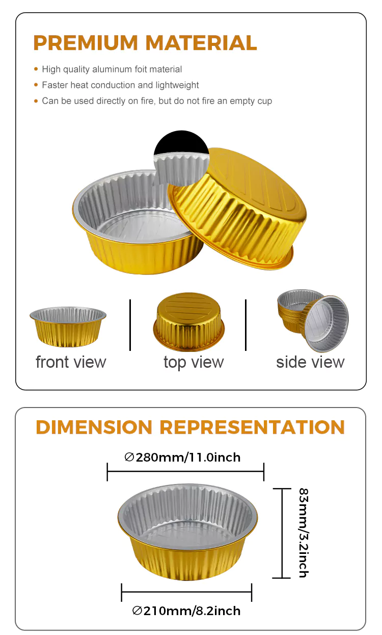 يعد أداء التوصيل الحراري الممتاز أحد المزايا الأساسية لحاويات رقائق الألومنيوم الذهبية ذات السعة الكبيرة التي يمكن التخلص منها. تقوم رقائق الألومنيوم بتوصيل الحرارة بسرعة وبشكل متساوٍ. سواء تم خبزه في الفرن، أو تسخينه على لهب مفتوح أو في فرن الميكروويف، فإنه يمكن ضمان تسخين الطعام بالتساوي، وتقصير وقت الطهي والحفاظ على النكهة الأصلية للمكونات. التصميم الدائري أكثر ملاءمة لتدوير الحرارة. مقترنًا بغطاء رقائق الألومنيوم القابل للغلق، فإنه لا يمكنه منع فقدان الرطوبة فحسب، بل يمكنه أيضًا تحقيق الحفظ والتدفئة المتكاملين. أثناء تسليم الطلبات الخارجية، يمكنها الحفاظ على الطعام دافئًا بشكل فعال، مما يسمح للمستهلكين بالاستمتاع بالطعام الساخن في أي وقت.