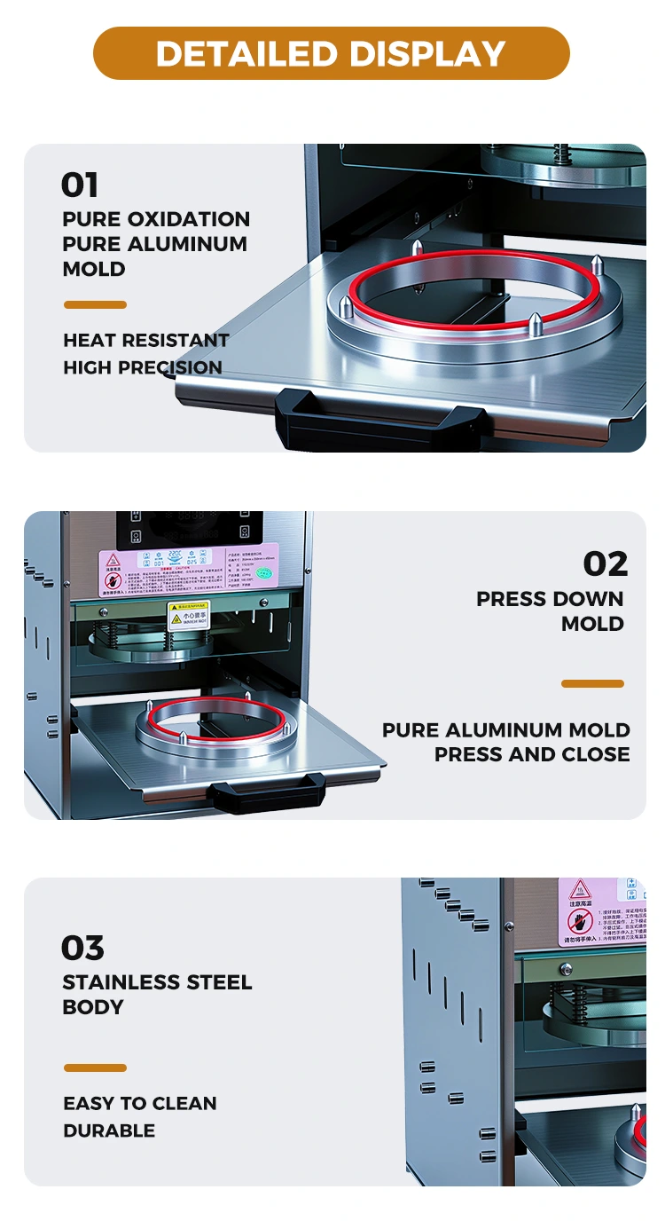 القدرة على التكيف القوية والتشغيل البسيط: متوافق تمامًا مع صندوق الغداء الذهبي هذا، ومتوافق أيضًا مع مختلف عبوات الأفلام المركبة PP/PE. ليس هناك حاجة إلى تدريب احترافي، ويمكنك البدء خلال 10 ثوانٍ فقط. ما عليك سوى إغلاق صندوق الغداء ومحاذاته، والضغط بلطف على مانع التسرب الحراري لمدة 3 إلى 5 ثوانٍ لإكمال الختم، مما يحسن بشكل كبير من كفاءة التغليف.