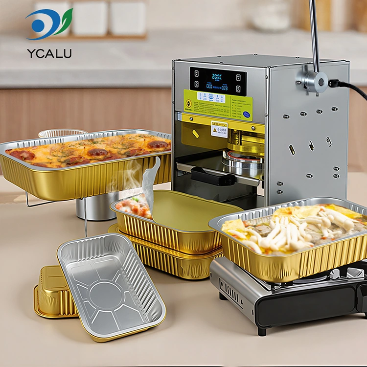 • ماكينة إغلاق حراري يدوية بحاويات رقائق الألومنيوم الذهبيةماكينة إغلاق حراري يدوية بحاويات رقائق الألومنيوم الذهبية