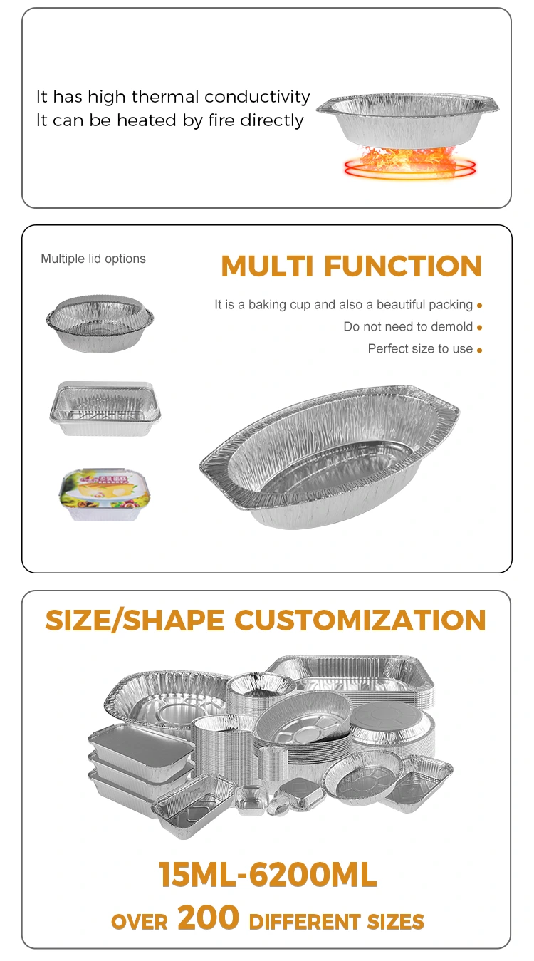 يوفر مورد رقائق الألومنيوم Yunchu حاويات رقائق من الألومنيوم الخبز البيضاوي من أجل الطهي المنزلي ، والمخابز ، ومتاجر السلسلة ، وتسليم الطعام المبرد. مصنوعة من مواد رقائق الألومنيوم من الدرجة الغذائية ، تتميز هذه الحاوية بشكل بيضاوي فريد يجعلها تبرز بين العديد من صناديق الخبز الفضية. هذه الحاوية مناسبة بشكل خاص لعقد المناديل الساخنة والفواكه والخبز وجميع أنواع الأطعمة المعادلة ، ويمكنها تلبية احتياجات مجموعة واسعة من أدوات المائدة. بسبب الموصلية الحرارية الجيدة ، يمكن أن تتبدد درجات حرارة عالية بالتساوي ، مما يضمن تسخين الطعام بالتساوي. بالإضافة إلى ذلك ، فإنه يحتوي على قدرة معينة من الحمل ومقاومة الضغط ، والحفاظ على الاستقرار حتى في حالة المداخن المتعددة ، ومنع التشوه ، وهو مثالي للاستخدام أثناء النقل. من أجل التكيف بشكل أفضل مع السيناريوهات والاحتياجات المختلفة ، يمكن أيضًا تخصيص هذه الحاوية وفقًا لمتطلبات العملاء وتوفير أغطية مطابقة لمزيد من التطبيق العملي.