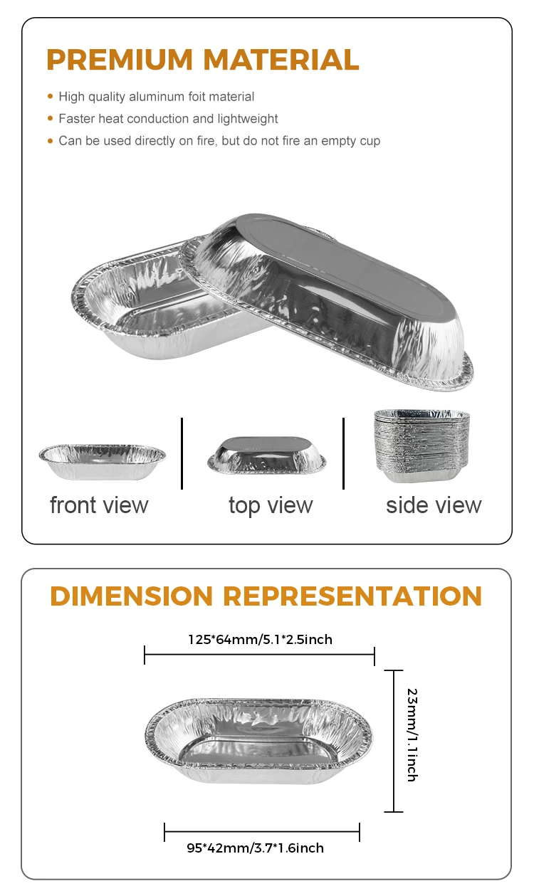 yunchu الألومنيوم رقائق بيضاوية مشوي الفضة من الألومنيوم حاوية الأطعمة هي حاوية صغيرة من رقائق الألومنيوم مصممة للخبز الطويل ، ملفات تعريف الارتباط المخبوزة ، الطعام ، المحار ، الصلصات وغيرها من الأطعمة. لا يقتصر الأمر على أنه مناسب لصلصات التعبئة والتغليف والانخفاضات والتوابل الصغيرة وعينات الخبز ، ولكنه مناسب أيضًا بشكل خاص لعرض الصلصات وتوزيعها. الحاوية مصنوعة من مواد رقائق الألومنيوم من الدرجة الغذائية ، مصبوبة في قطعة واحدة ، مع جدار ناعم يشبه المرآة ، وهو جميل وعملي ، والذي يمكن أن يعزز بشكل كبير الملمس العام للتغليف ، وخاصةً لسيناريوهات خدمة الطعام التي تولي اهتمامًا بالتفاصيل وجودة الخدمة.