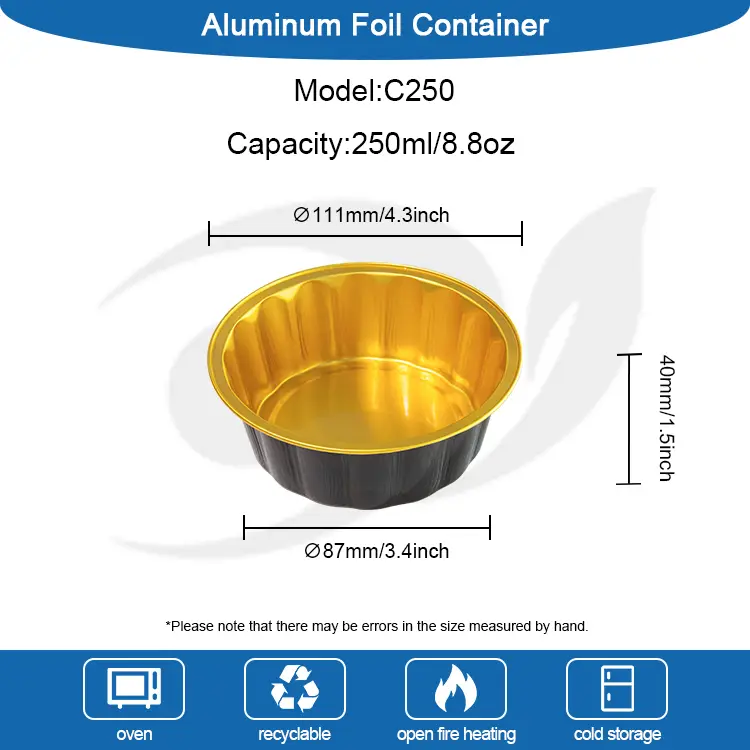 وعاء دائري للحلوى الملساء حاويات الألومنيوم ، القطر العلوي 110 ملم (4.3 بوصة) ، قطر أقل 87 مم (3.4 بوصة) ، ارتفاع 40 مم (1.5 بوصة) ، وسعة 250 مل (8.8 أوقية) ، مناسبة لصنع الكعك الصغير والمتوسطة والطعام الأخرى ، تصميم الخفيفة هو أكثر ملاءمة للعملية ، تتكون مواد رقائق الألومنيوم من مواد رقائق الألومنيوم من الدرجة الغذائية لضمان استخدامها بأمان.