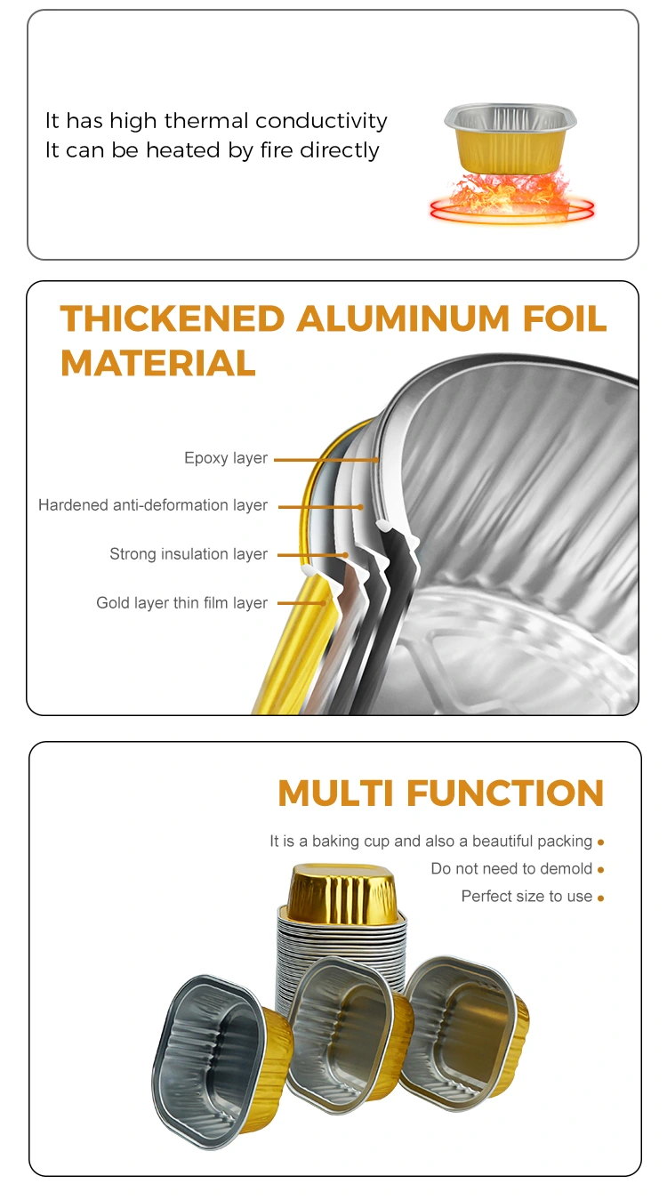 صُممت لتكون جميلة وعملية على حد سواء، فأكواب خبز الحلوى المربعة مصنوعة من رقائق الألومنيوم ذات الجدران الناعمة مصممة لتحمل درجات الحرارة العالية دون أن تبهت. إنه مصنوع من مادة 8011-0 ولديه أقصى درجة حرارة مقاومة للحرارة تصل إلى 660 درجة مئوية. يمكن أن تصل درجة حرارة معدات المطبخ العامة أيضًا إلى 200 درجة مئوية، مما يضمن عدم احتراق الطعام أو تشققه. لأنه مصنوع من مادة سميكة، يمكن استخدامه عدة مرات. تمت معالجة الأمر برمته بأربع طبقات من التكنولوجيا. بعد الطهي، يمكنك التقاطه وتناوله دون القلق بشأن التشوه. بالإضافة إلى ذلك، فهو أيضًا مريح جدًا للتنظيف، ويمكنك الاتصال مباشرة بالمكونات للحفاظ على النظافة.